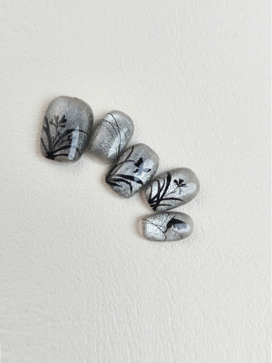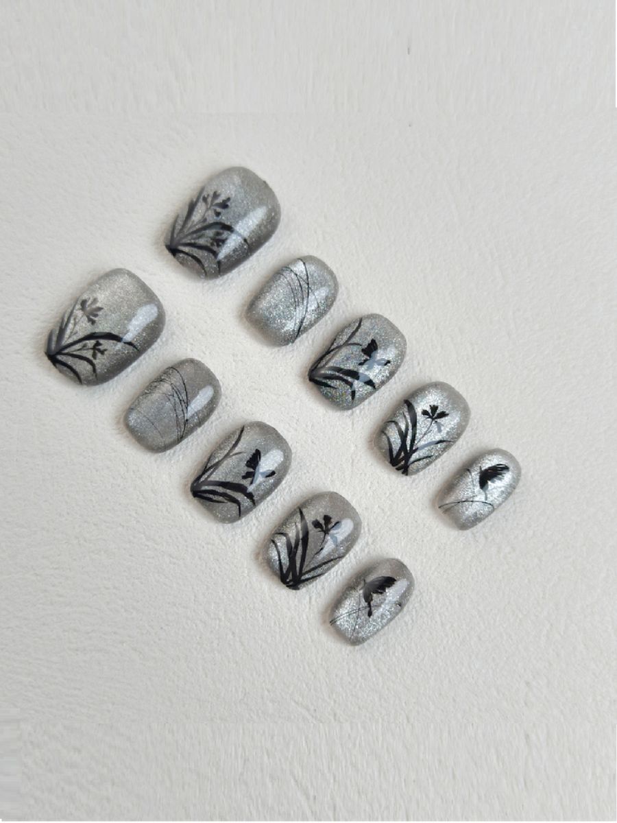 This nail design uses black as the base to symbolize solemnity and depth, with orchid patterns presented in simple and graceful lines to showcase the orchid's elegance and unique charm. It combines traditional Eastern elements with modern minimalism, creating a serene and elegant atmosphere, suitable for women pursuing elegance and unique style.