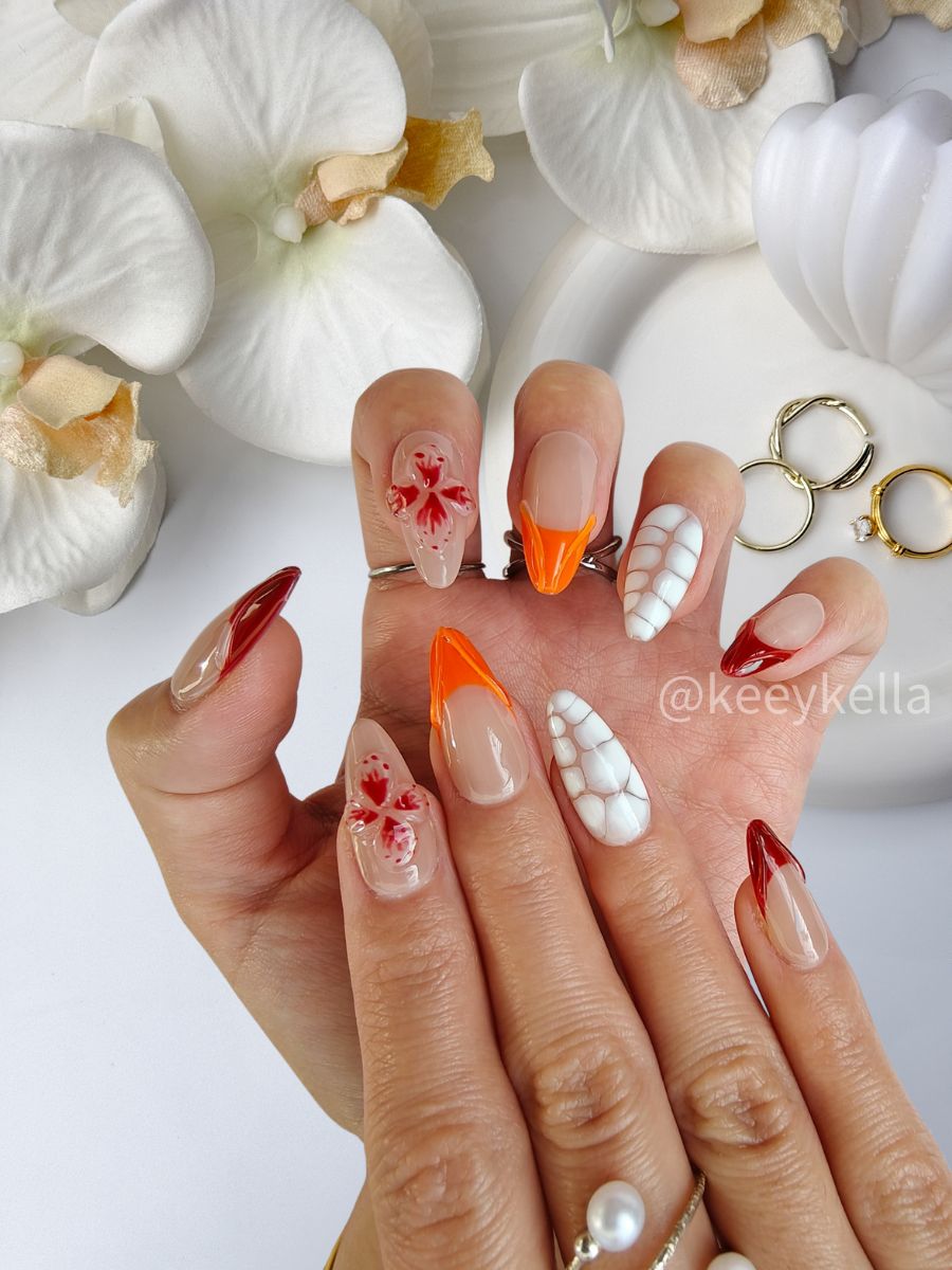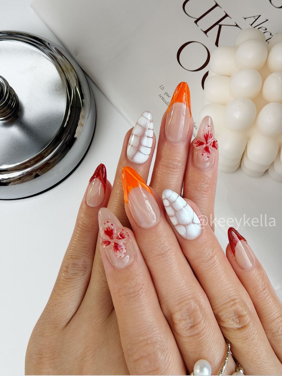 The texture of white and beige, combined with deep red and orange, is like a flower blooming in the desert, resilient and full of vitality.