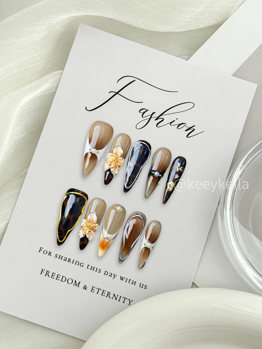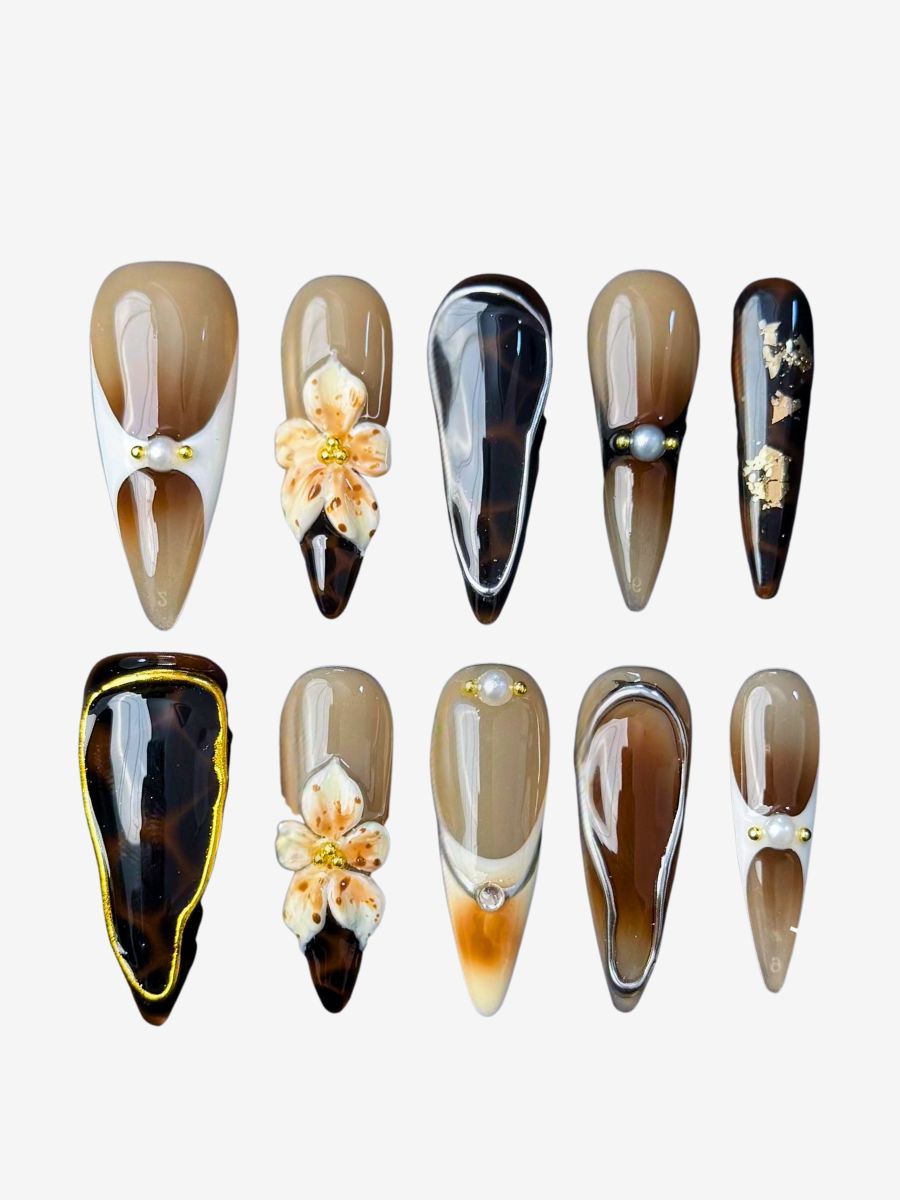 A gradient of dark brown and beige with gold and argent lines, floral and pearls accents, resembling a golden mirage in the desert, mysterious and captivating.