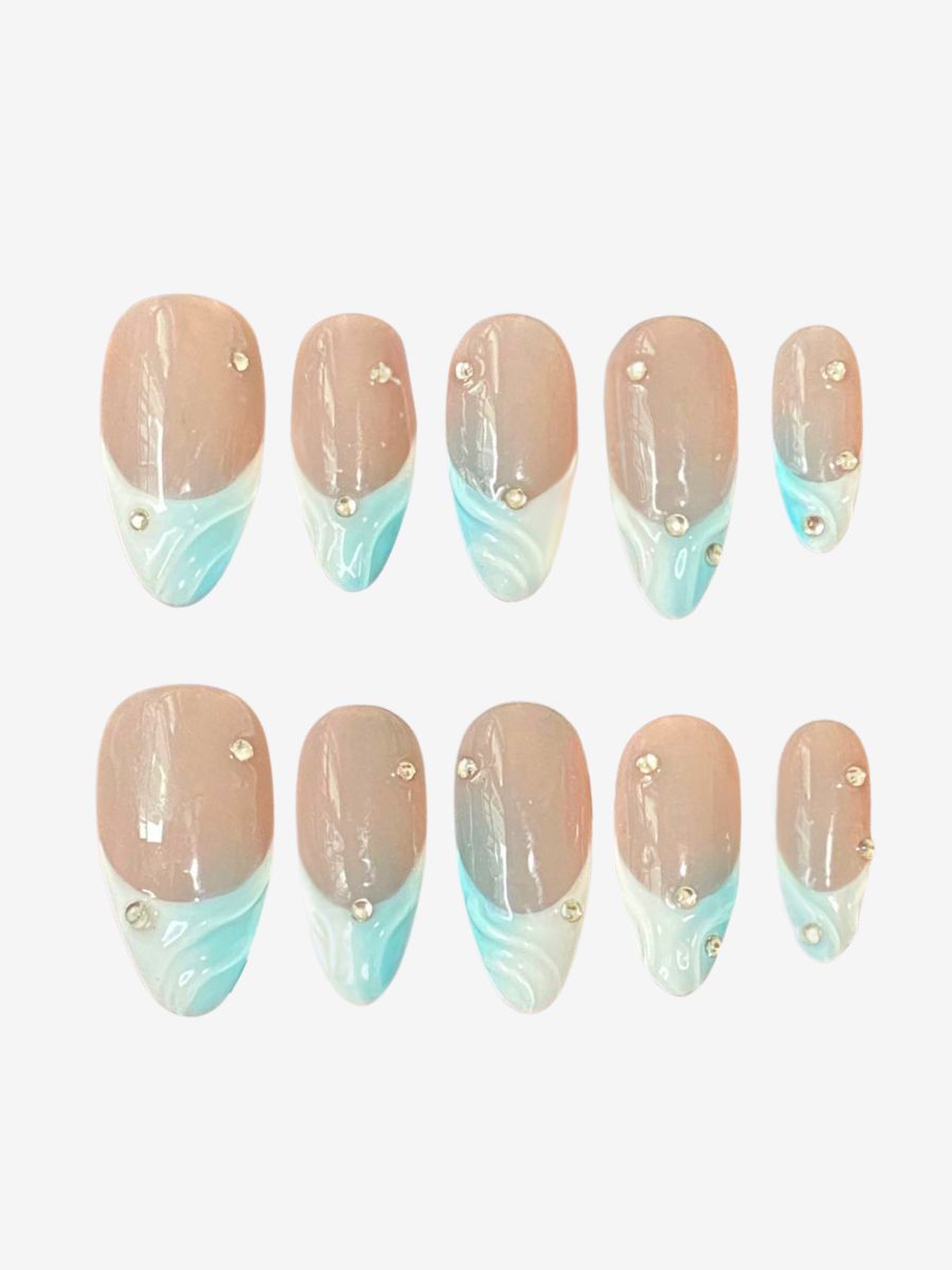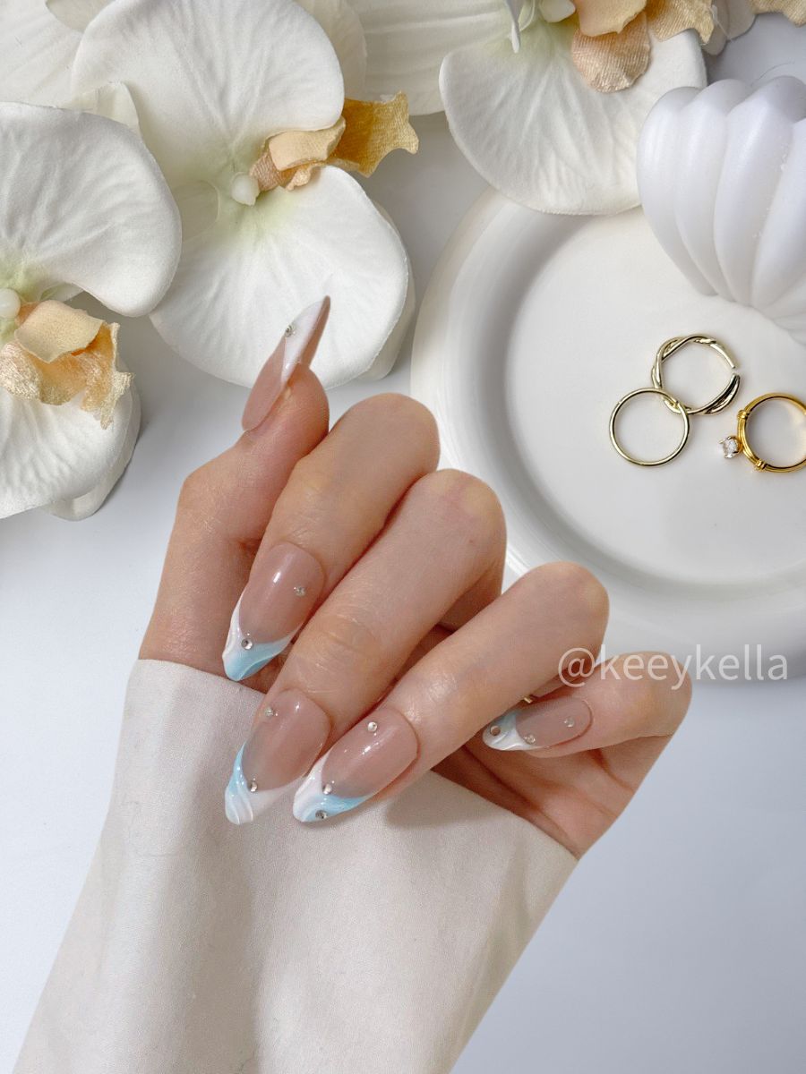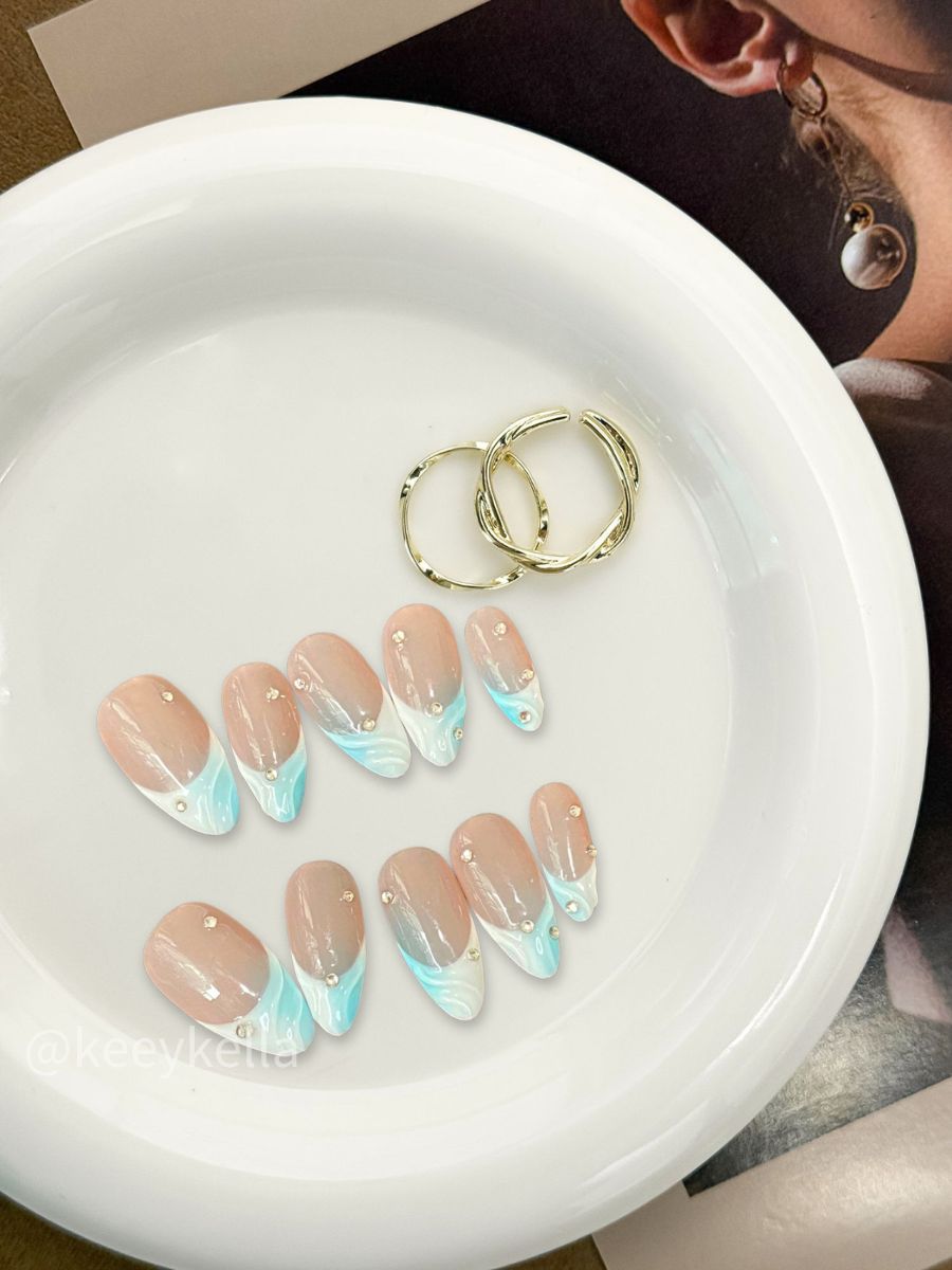 Inspired by the tranquil beauty of the sea. Soft beige and light blue mimic the beach and gentle waves, while pearls represent precious moments washed ashore.