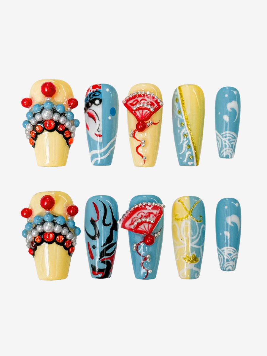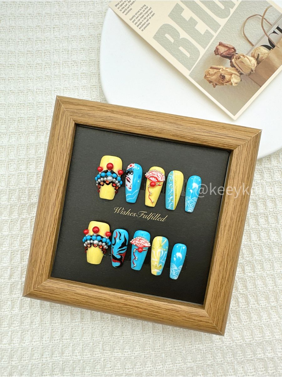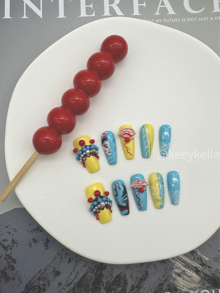 This design reimagines Peking Opera'siconic elements through a modern lens. Delicate brushstrokes mimic the lines of opera face paint, while blue and yellow tones create contemporary tension and cultural fluidity, bridging heritage craftsmanship with wearable edginess. It whispers tradition through avant-garde forms transforming fingertips into micro-stages of cultural dialogue.