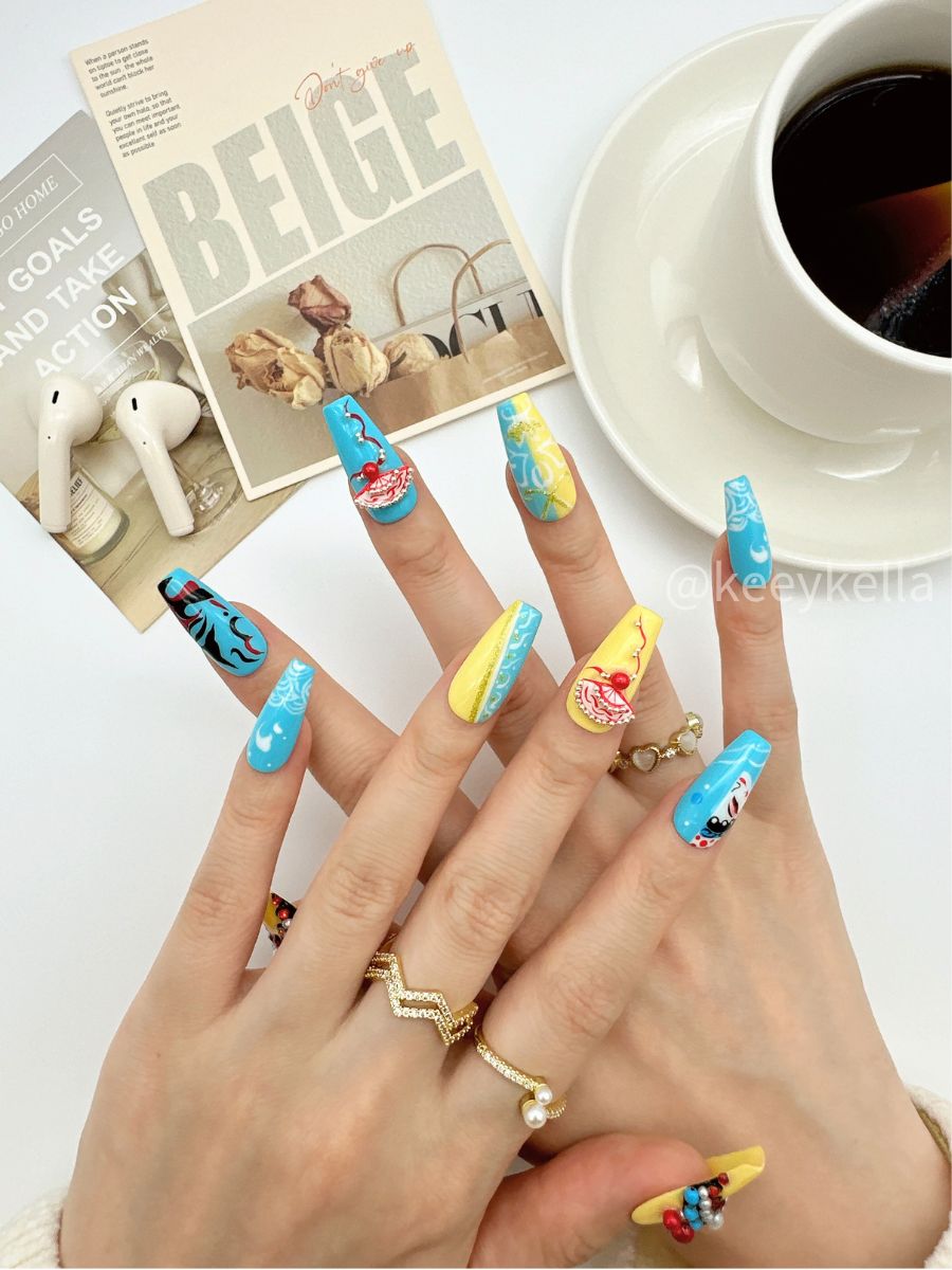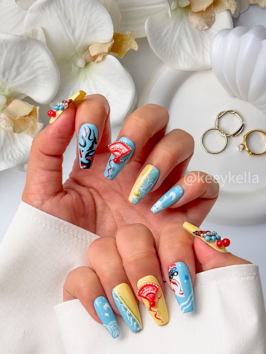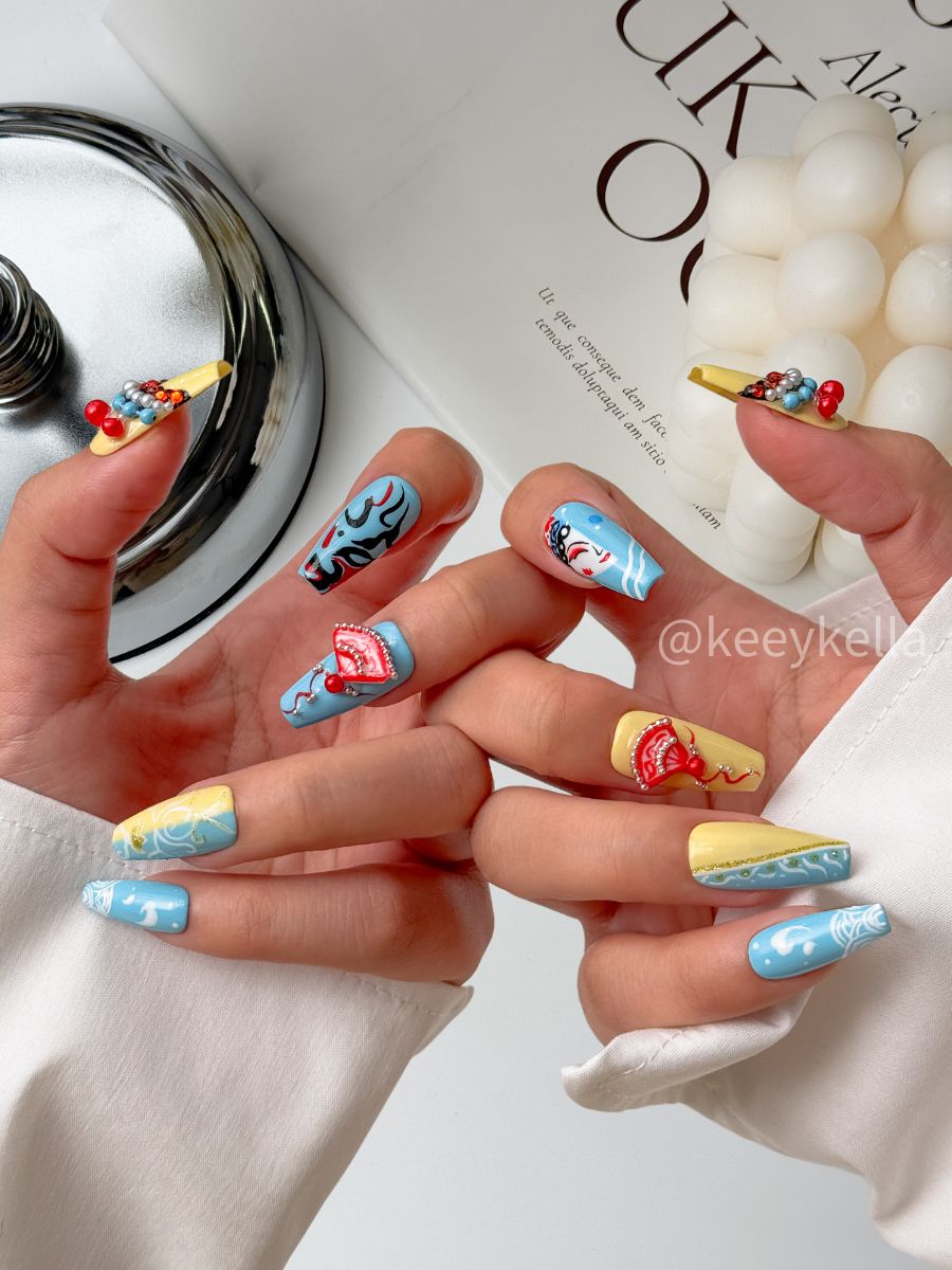 This design reimagines Peking Opera'siconic elements through a modern lens. Delicate brushstrokes mimic the lines of opera face paint, while blue and yellow tones create contemporary tension and cultural fluidity, bridging heritage craftsmanship with wearable edginess. It whispers tradition through avant-garde forms transforming fingertips into micro-stages of cultural dialogue.